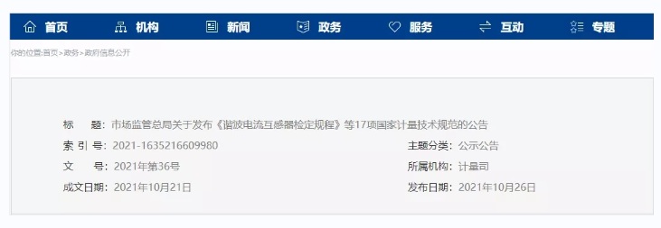 市場監管總局關于發布《諧波電流互感器檢定規程》等17項國家計量技術規范的公告