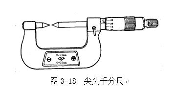 尖頭千分尺如圖3-18所示,主要用來測量零件的厚度、長度、直徑及小溝槽。如鉆頭和偶數槽絲錐的溝槽直徑等。