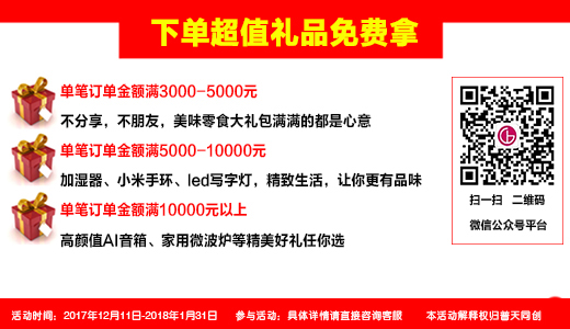 2017年12月11日—2018年1月31日“預(yù)存貨款送豪華大禮,活動(dòng)期間下單更有超值禮品免費(fèi)拿”雙雙有豪禮!