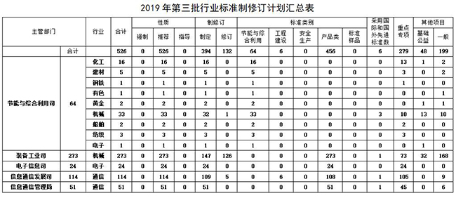 2019年第三批標準修制訂計劃共安排項目計劃526項,其中制定394項、修訂132項;重點專項標準279項、基礎公益類標準48項、一般標準199項;產品類標準456項、工程建設標準6項、節能與綜合利用標準64項。這526項標準皆為推薦性質,涉及了化工、建材、鋼鐵、有色、黃金、機械、船舶、紡織、電子、通信等行業。無疑,這批標準的修制訂將是對標準化體系的進一步完善,能有效促進我國標準化水平的提升,同時也將推動行業的高質量發展和創新發展。