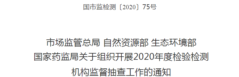 2020年5月14日,市場監(jiān)管總局、自然資源部、生態(tài)環(huán)境部、國家藥監(jiān)局聯(lián)合發(fā)布了《關于組織開展2020年度檢驗檢測機構監(jiān)督抽查工作的通知》。通知顯示,為加強檢驗檢測機構監(jiān)管,營造公平有序的市場環(huán)境,為疫情防控和經濟社會發(fā)展提供技術支撐,市場監(jiān)管總局、自然資源部、生態(tài)環(huán)境部和國家藥監(jiān)局決定于2020年6月至10月在全國范圍內組織開展檢驗檢測機構“雙隨機、一公開”監(jiān)督抽查。