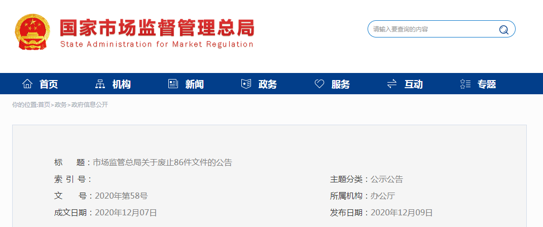 市場監管總局關于廢止86件文件的公告