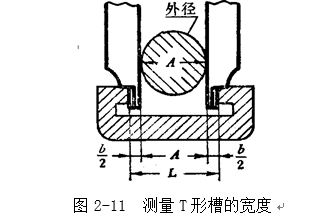 用游標卡尺測量T形槽的寬度,如圖2-11所示。測量時將量爪外緣端面的小平面,貼在零件凹槽的平面上,用固定螺釘把微動裝置固定,轉動調節螺母,使量爪的外測量面輕輕地與T形槽表面接觸,并放正兩量爪的位置 (可以輕輕地擺動一個量爪,找到槽寬的垂直位置),讀出游標卡尺的讀數圖2-11中用A表示。但由于它是用量爪的外測量面測量內尺寸的,卡尺上所讀出的讀數A是量爪內測量面之間的距離,因此必須加上兩個量爪的厚度b,才是T形槽的寬度。所以,T形槽的寬度L=A+b