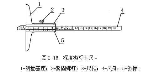 深度游標卡尺如圖2-16所示,用于測量零件的深度尺寸或臺階高低和槽的深度。它的結構特點是尺框3的兩個量爪連成一起成為一個帶游標測量基座1,基座的端面和尺身4的端面就是它的兩個測量面。如測量內孔深度時應把基座的端面緊靠在被測孔的端面上,使尺身與被測孔的中心線平行,伸入尺身,則尺身端面至基座端面之間的距離,就是被測零件的深度尺寸。它的讀數方法和游標卡尺完全一樣。