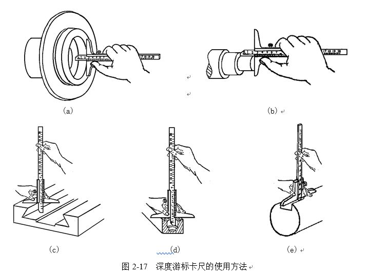 測量時,先把測量基座輕輕壓在工件的基準面上,兩個端面必須接觸工件的基準面,圖2-17(a) 所示。測量軸類等臺階時,測量基座的端面一定要壓緊在基準面,圖2-17(b)(c) 所示,再移動尺身,直到尺身的端面接觸到工件的量面(臺階面)上,然后用緊固螺釘固定尺框,提起卡尺,讀出深度尺寸。多臺階小直徑的內孔深度測量,要注意尺身的端面是否在要測量的臺階上,圖2-17(d) 。當基準面是曲線時,圖2-17(e) ,測量基座的端面必須放在曲線的最高點上,測量出的深度尺寸才是工件的實際尺寸,否則會出現測量誤差。
