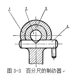百分尺的制動器,就是測微螺桿的鎖緊裝置,其結(jié)構(gòu)如圖3-3所示。制動軸4的圓周上,有一個開著深淺不均的偏心缺口,對著測微螺桿2。當(dāng)制動軸以缺口的較深部分對著測量桿時,測量桿2就能在軸套3內(nèi)自由活動,當(dāng)制動軸轉(zhuǎn)過一個角度,以缺口的較淺部分對著測量桿時,測量桿就被制動軸壓緊在軸套內(nèi)不能運動,達(dá)到制動的目的。