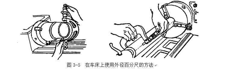 5  使用百分尺測量零件時(圖3-5),要使測微螺桿與零件被測量的尺寸方向一致。如測量外徑時,測微螺桿要與零件的軸線垂直,不要歪斜。測量時,可在旋轉測力裝置的同時,輕輕地晃動尺架,使測砧面與零件表面接觸良好。